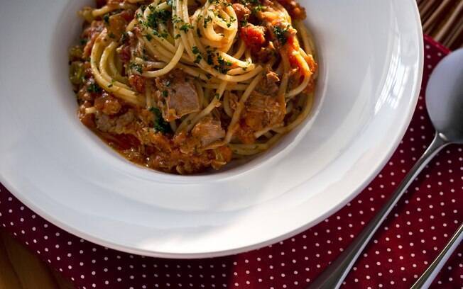 Hidratar as uvas passas em água por 20 minutos. Escorrer e reservar. Em uma frigideira funda, dourar levemente o alho cortado em cubinhos no azeite. Adicionar os tomates cortados em pedaços pequenos e cozinhar por cerca de 20 minutos. Acrescentar o atum, sem o óleo, e cozinhar por mais 20 minutos.